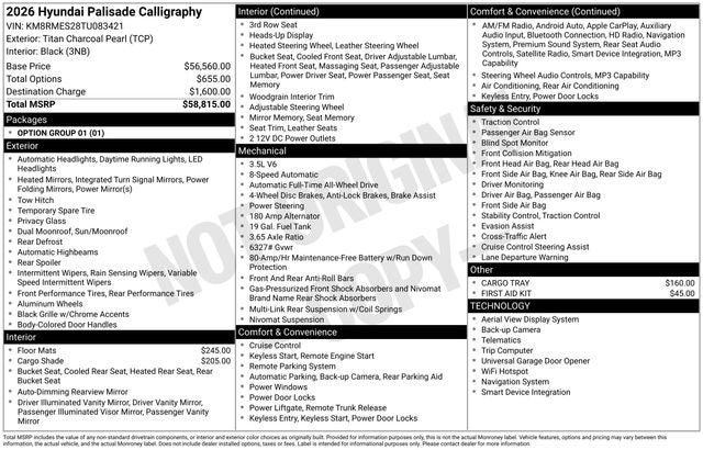 Experience the pinnacle of luxury and capability in the 2026 Hyundai Palisade Calligraphy. Visit our showroom today and let us demonstrate how this exceptional vehicle can elevate your driving experience. We're confident you'll be impressed by its uncompromising quality and the value it delivers. Price includes: $750 - Hyundai HMF Dealer Choice : $750 discount and 5.39% APR for 24 months. $44.05 per $1000 financed. Available to well qualified buyers who finance through Hyundai Motor Finance. H704. Exp. 02/02/2026