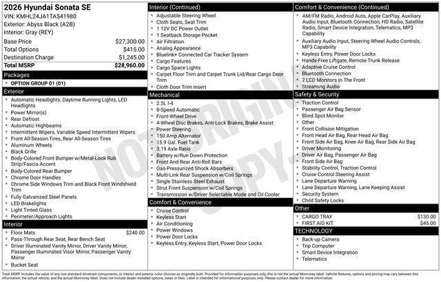 As you consider your next sedan, we invite you to experience the exceptional value and refined driving dynamics of the 2026 Hyundai Sonata SE. This sedan is a true testament to Hyundai's commitment to excellence, and we are confident that it will exceed your expectations. Visit our showroom today to schedule a test drive and discover the joy of owning this remarkable vehicle. Price includes: $500 - Hyundai HMF Dealer Choice : $500 discount and 5.39% APR for 24 months. $44.05 per $1000 financed. Available to well qualified buyers who finance through Hyundai Motor Finance. H704. Exp. 02/02/2026