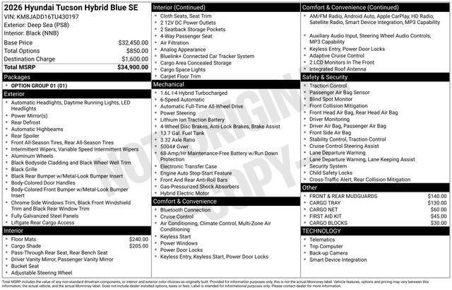 Elevate your driving experience with the 2026 Hyundai Tucson Hybrid Blue. This exceptional SUV combines style, performance, and cutting-edge technology, making it the perfect choice for the discerning driver. Visit our showroom today and discover the true joy of driving. Price includes: $1250 - Hyundai HMF Dealer Choice : $1250 discount and 5.39% APR for 24 months. $44.05 per $1000 financed. Available to well qualified buyers who finance through Hyundai Motor Finance. H704. Exp. 02/02/2026