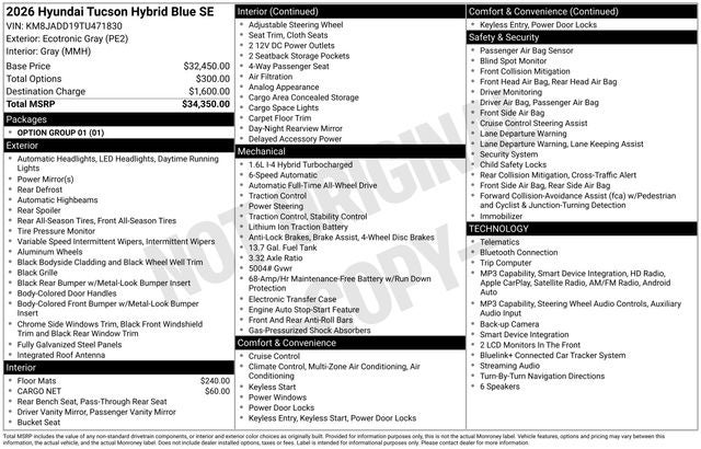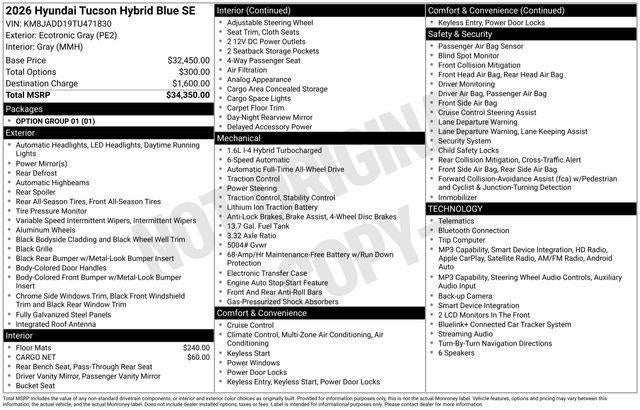 Elevate your commute or weekend adventures with the 2026 Hyundai Tucson Hybrid Blue SE. This exceptional SUV offers unparalleled style, efficiency, and safety, making it the perfect choice for those who demand the best. Visit our showroom today and discover why the Tucson Hybrid Blue SE should be your next vehicle. Price includes: $2750 - Hyundai HMF Dealer Choice : $2750 discount and 5.39% APR for 24 months. $44.05 per $1000 financed. Available to well qualified buyers who finance through Hyundai Motor Finance. H704. Exp. 04/30/2026