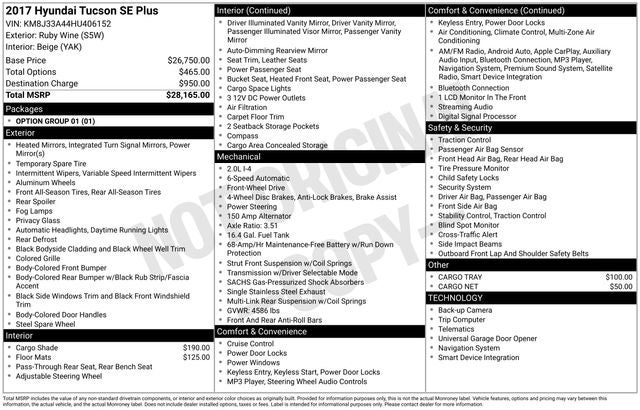This Tucson SE Plus is more than just a pretty face. Under the hood, you'll find a 2.0L DOHC engine paired with a 6-Speed Automatic with Shiftronic transmission, delivering a smooth and efficient performance. With an impressive 23 MPG in the city and 30 MPG on the highway, this SUV offers the perfect balance of power and fuel efficiency to tackle your daily adventures.