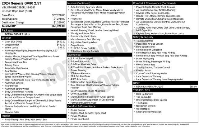 Adorned in a captivating Capri Blue exterior, this GV80 2.5T exudes a sense of refined elegance that is sure to turn heads wherever you go. Complementing the striking appearance are a host of premium features, including a Roof Rack Cross Bars and a Rear Bumper Applique, elevating both the style and functionality of this exceptional SUV.